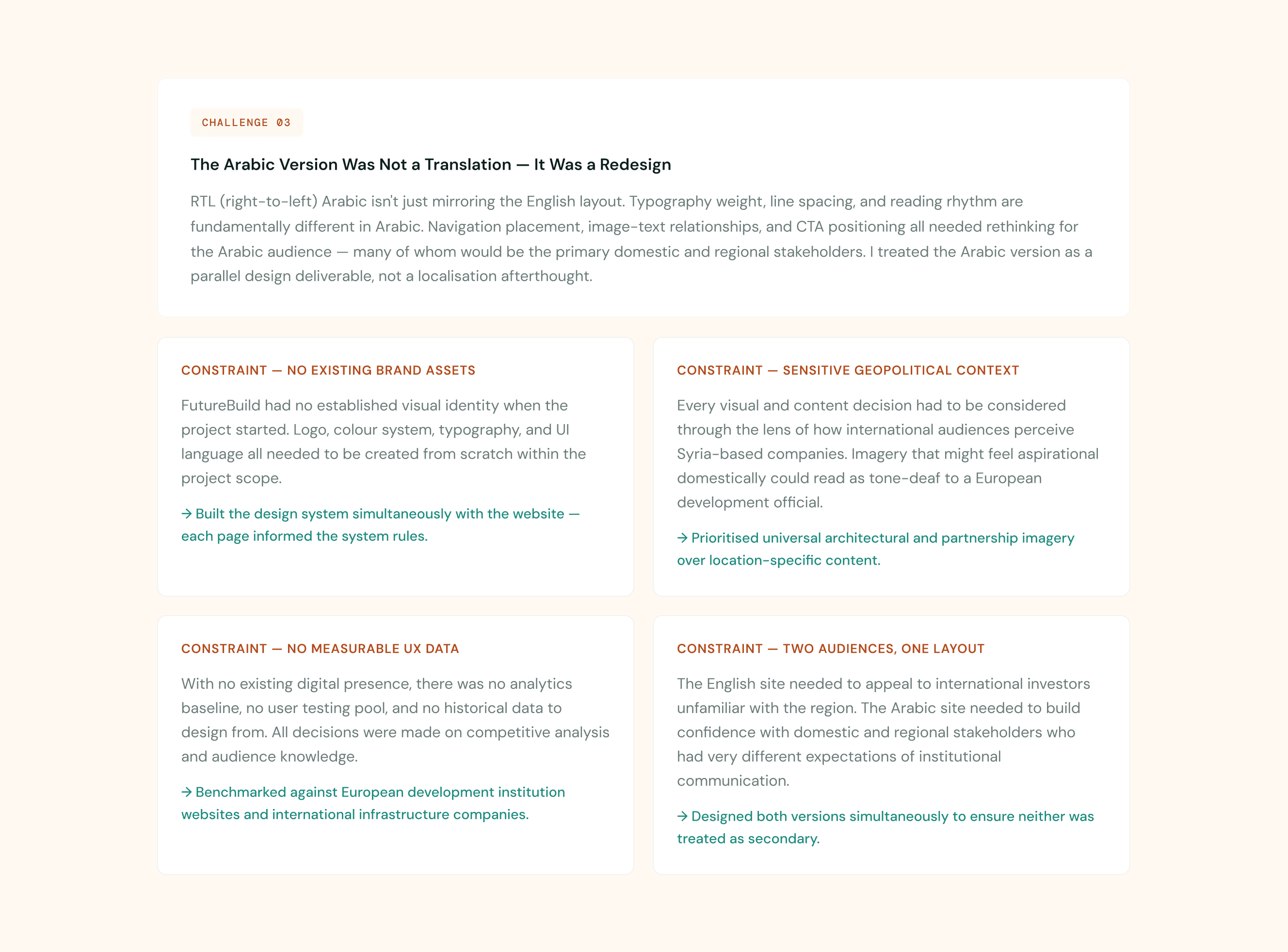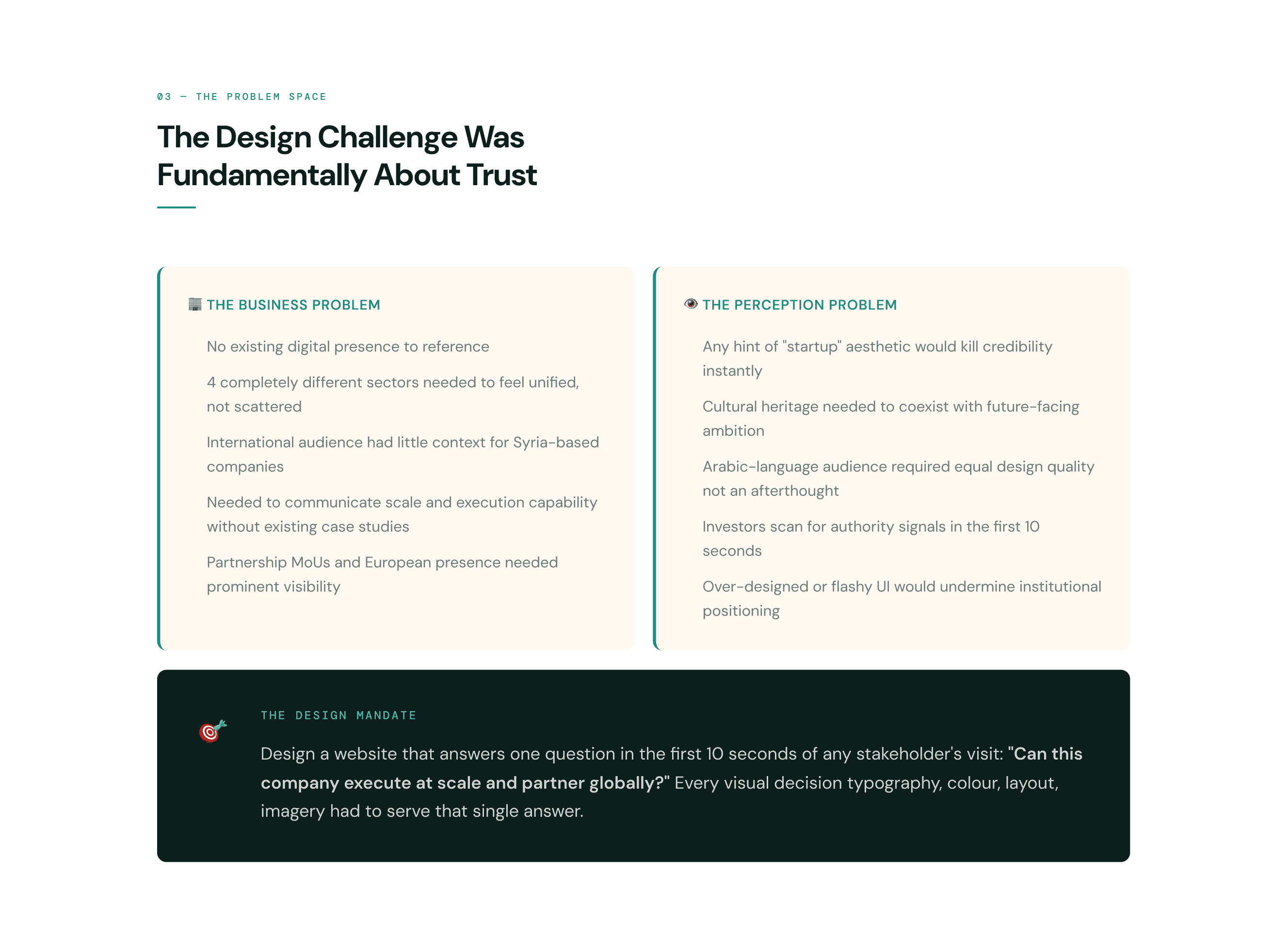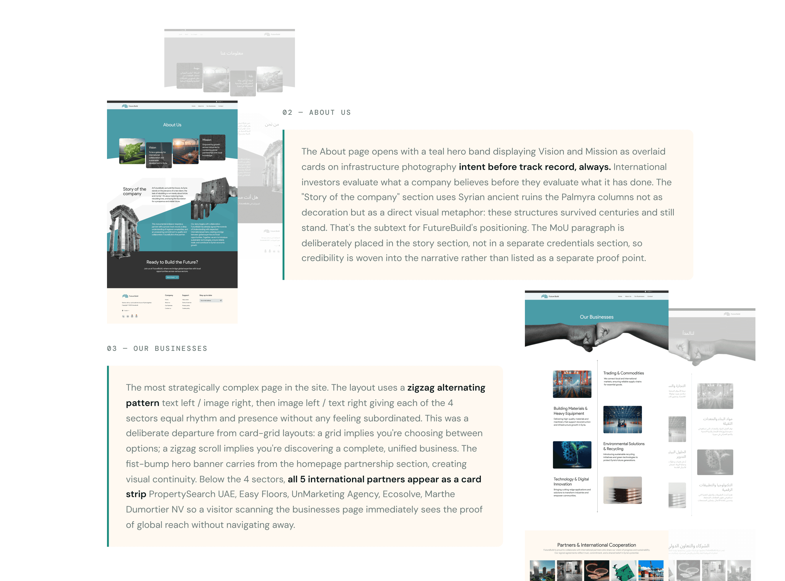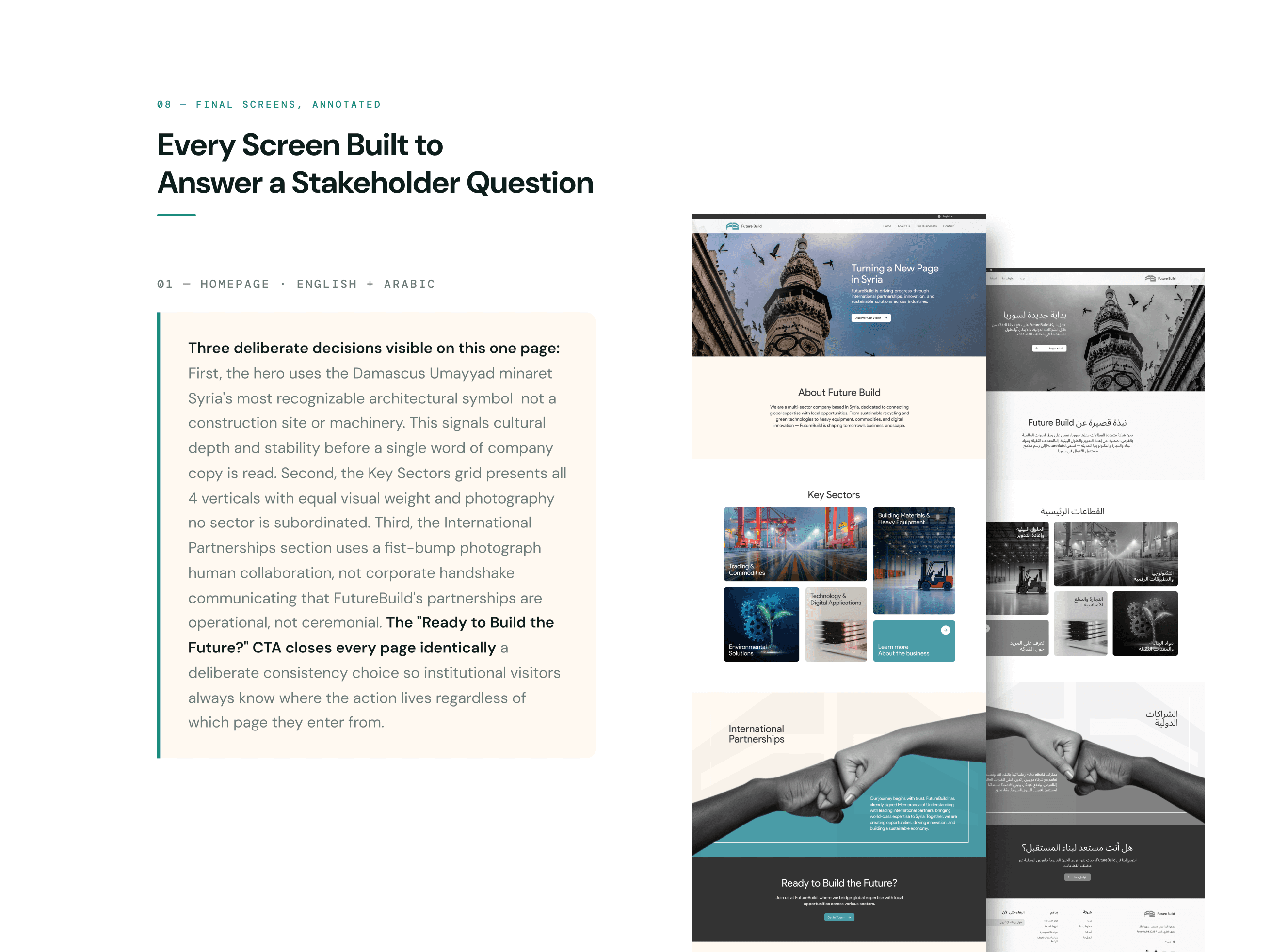 A multi-sector infrastructure company rebuilding Syria needed a website that could walk into rooms with European investors and government officials and be taken seriously. I designed the complete digital identity from scratch: brand, UI system, bilingual English and Arabic platform, and 5 dedicated international partner pages. The website directly contributed to FutureBuild securing a major international development grant.