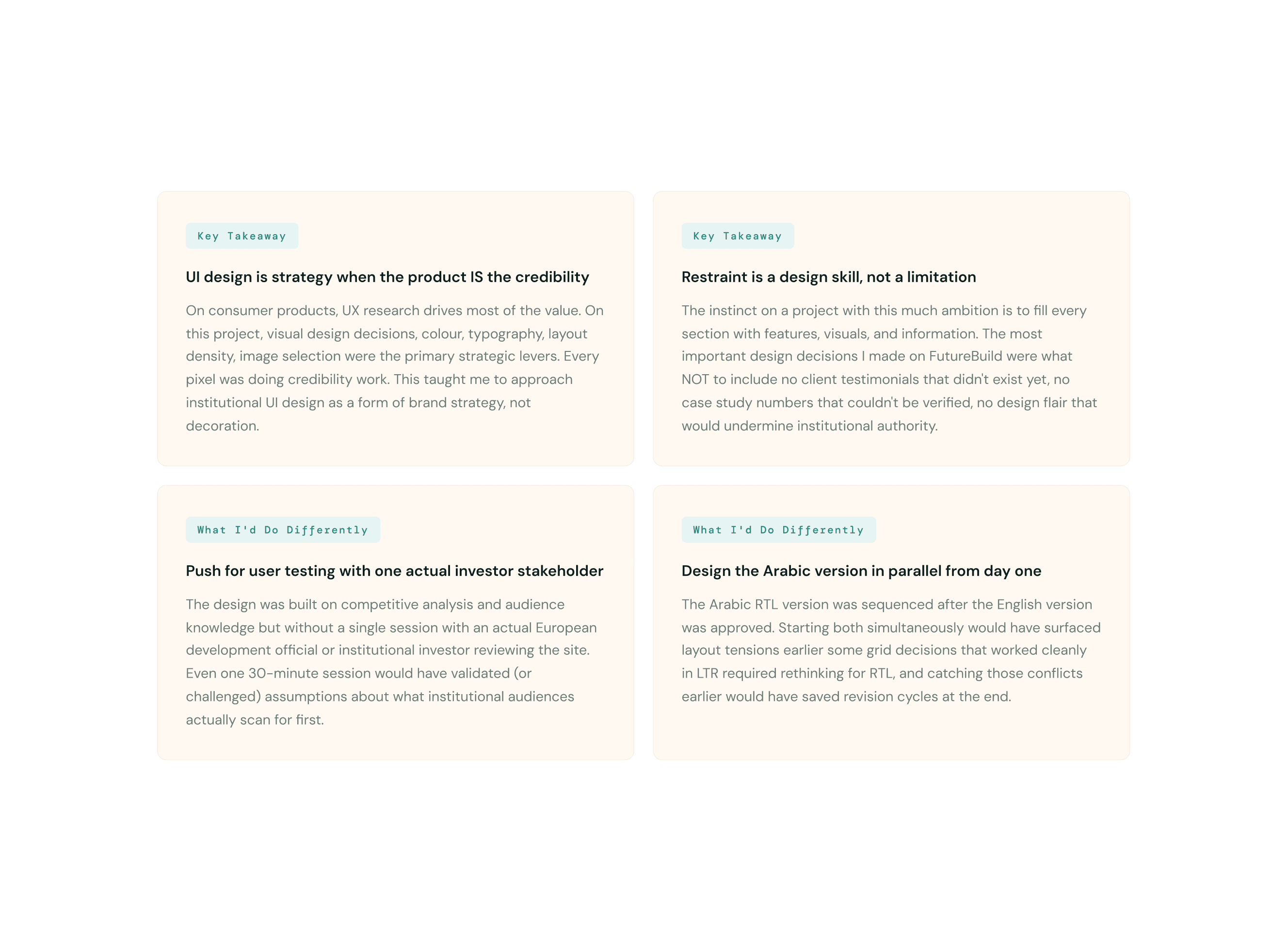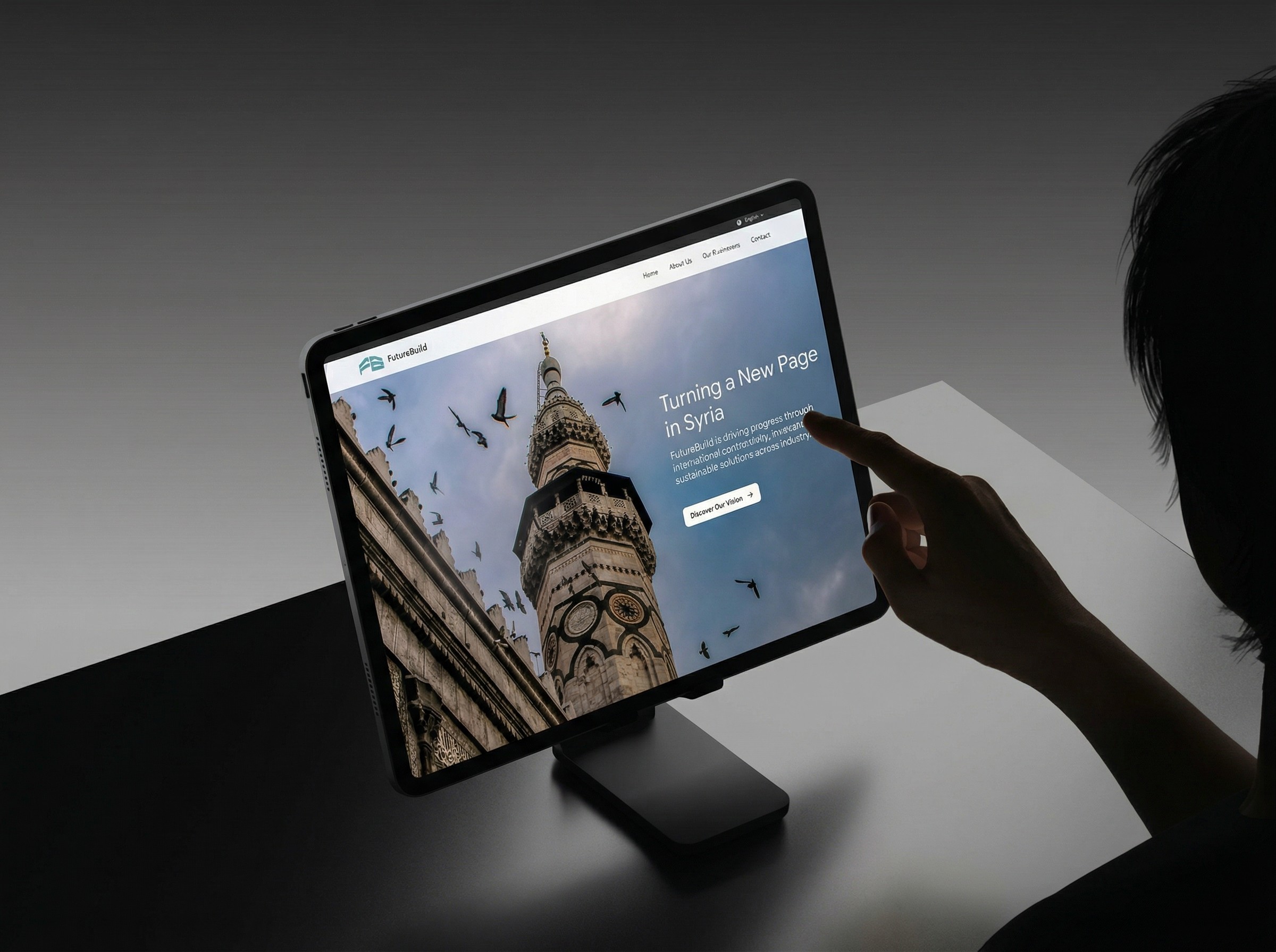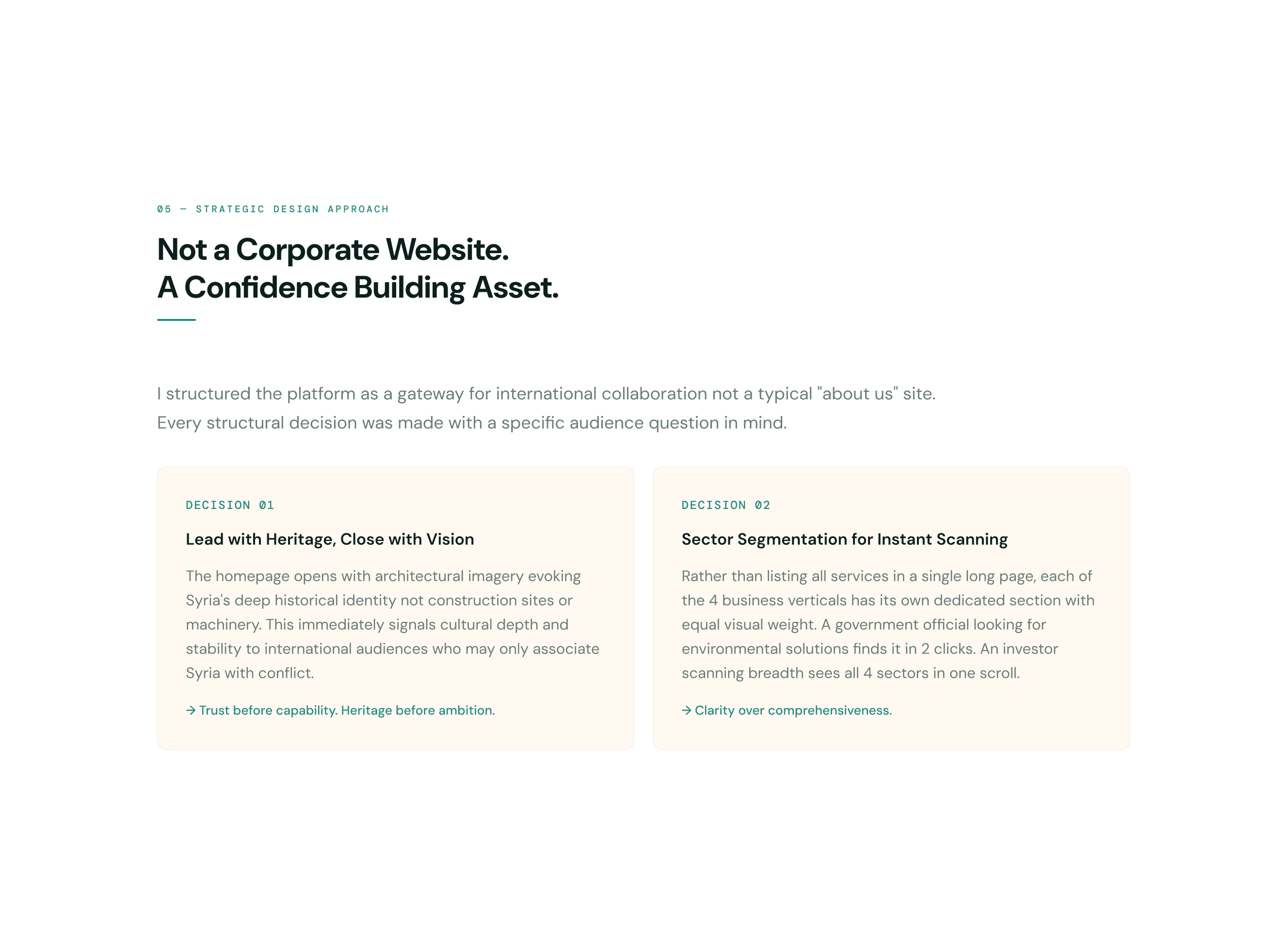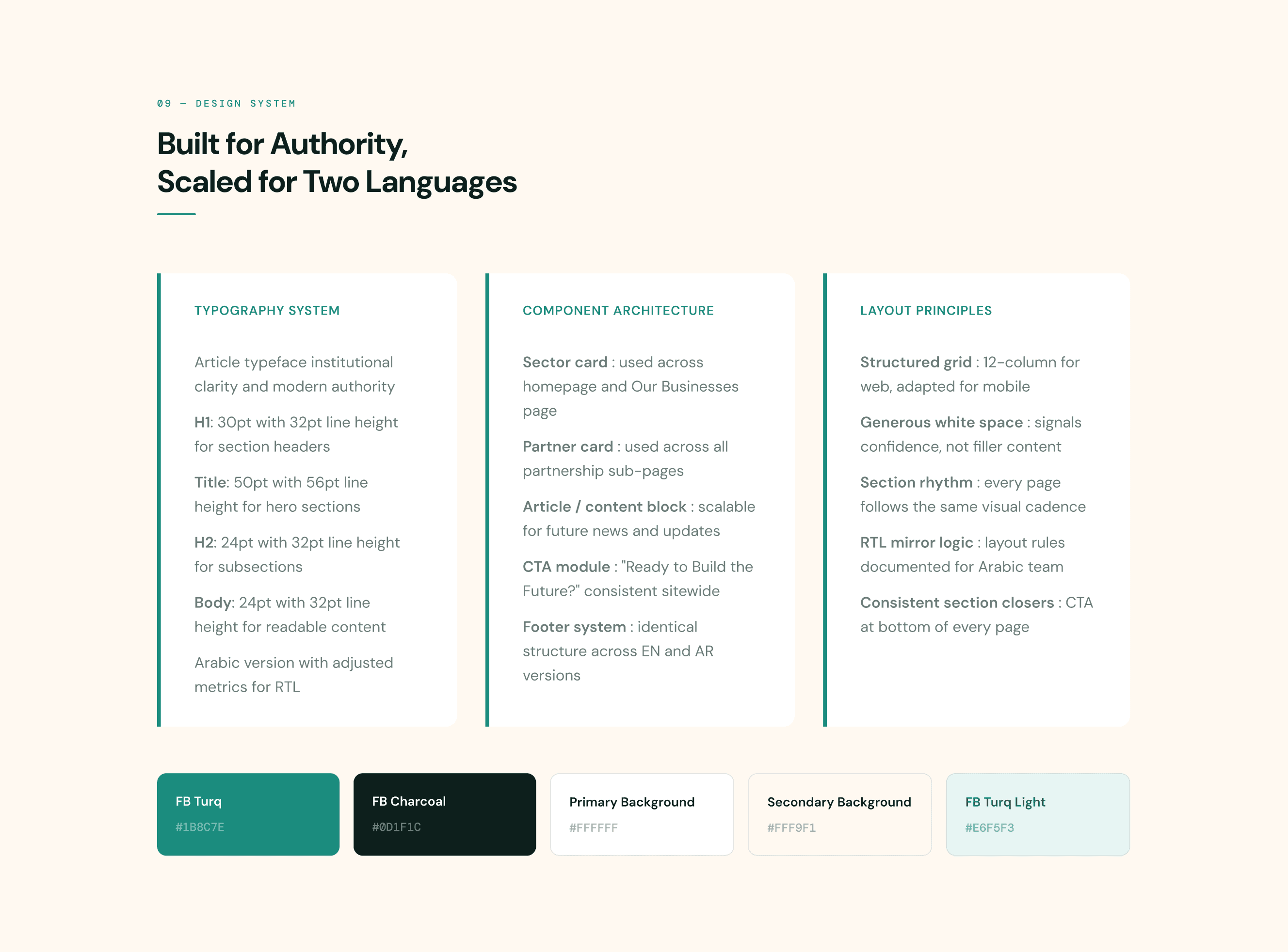 A multi-sector infrastructure company rebuilding Syria needed a website that could walk into rooms with European investors and government officials and be taken seriously. I designed the complete digital identity from scratch: brand, UI system, bilingual English and Arabic platform, and 5 dedicated international partner pages. The website directly contributed to FutureBuild securing a major international development grant.