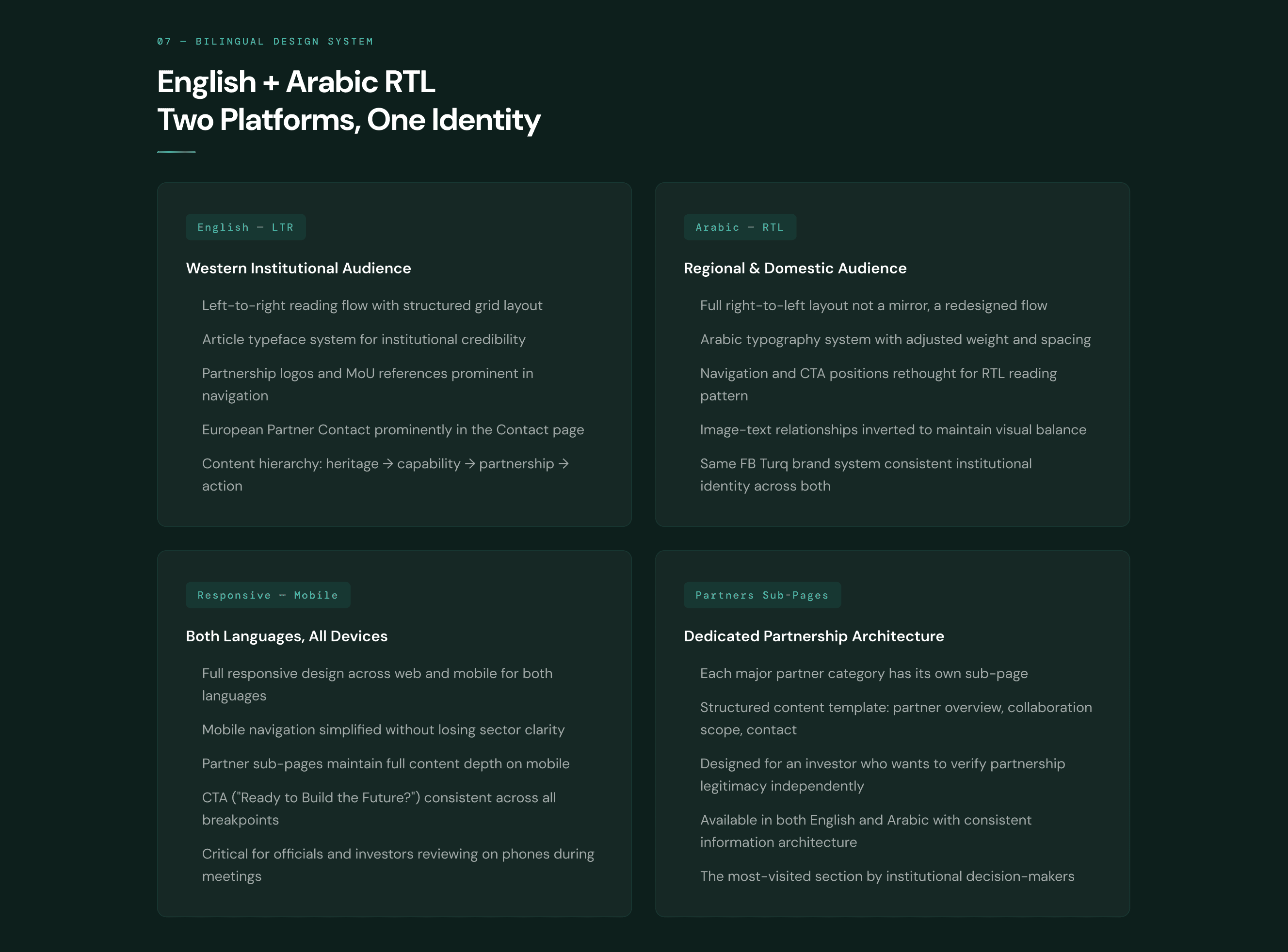 Solo UI Designer, responsible for brand identity creation, information architecture, UI design system, bilingual English and Arabic execution, and all partnership sub-page design.